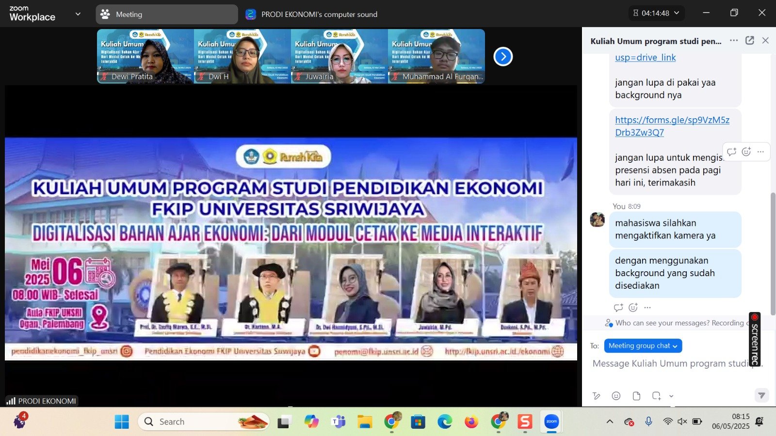Meskipun dilaksanakan secara daring, namun kegiatan ini dibuka secara langsung oleh Ibu ketua Jurusan Pendidikan Ilmu Pengetahuan Sosial Dr. Hudaidah, M.Pd. secara langsung di aula FKIP kampus ogan Palembang. Beliau memberikan dukungan kepada program studi pendidikan ekonomi atas pencapaian yang telah dilakukan melalui penyelenggaraan kegiatan rutin tahunan kuliah umum disetiap prodi. Kuliah umum hari ini merupakan kuliah umum perdana yang dilakukan oleh program studi pendidikan ekonomi di tahun 2025. Semoga kegiatan yang dilaksanakan hari ini dapat memberikan informasi yang bermanfaat bagi pengembangan ilmu pengetahuan khususnya bagi mahasiswa calon pendidik ekonomi di program studi pendidikan ekonomi.
