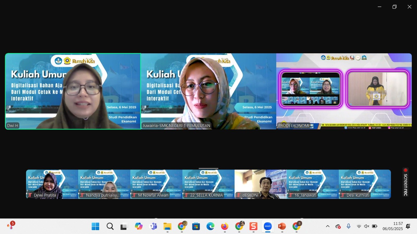 Meskipun dilaksanakan secara daring, namun kegiatan ini dibuka secara langsung oleh Ibu ketua Jurusan Pendidikan Ilmu Pengetahuan Sosial Dr. Hudaidah, M.Pd. secara langsung di aula FKIP kampus ogan Palembang. Beliau memberikan dukungan kepada program studi pendidikan ekonomi atas pencapaian yang telah dilakukan melalui penyelenggaraan kegiatan rutin tahunan kuliah umum disetiap prodi. Kuliah umum hari ini merupakan kuliah umum perdana yang dilakukan oleh program studi pendidikan ekonomi di tahun 2025. Semoga kegiatan yang dilaksanakan hari ini dapat memberikan informasi yang bermanfaat bagi pengembangan ilmu pengetahuan khususnya bagi mahasiswa calon pendidik ekonomi di program studi pendidikan ekonomi.