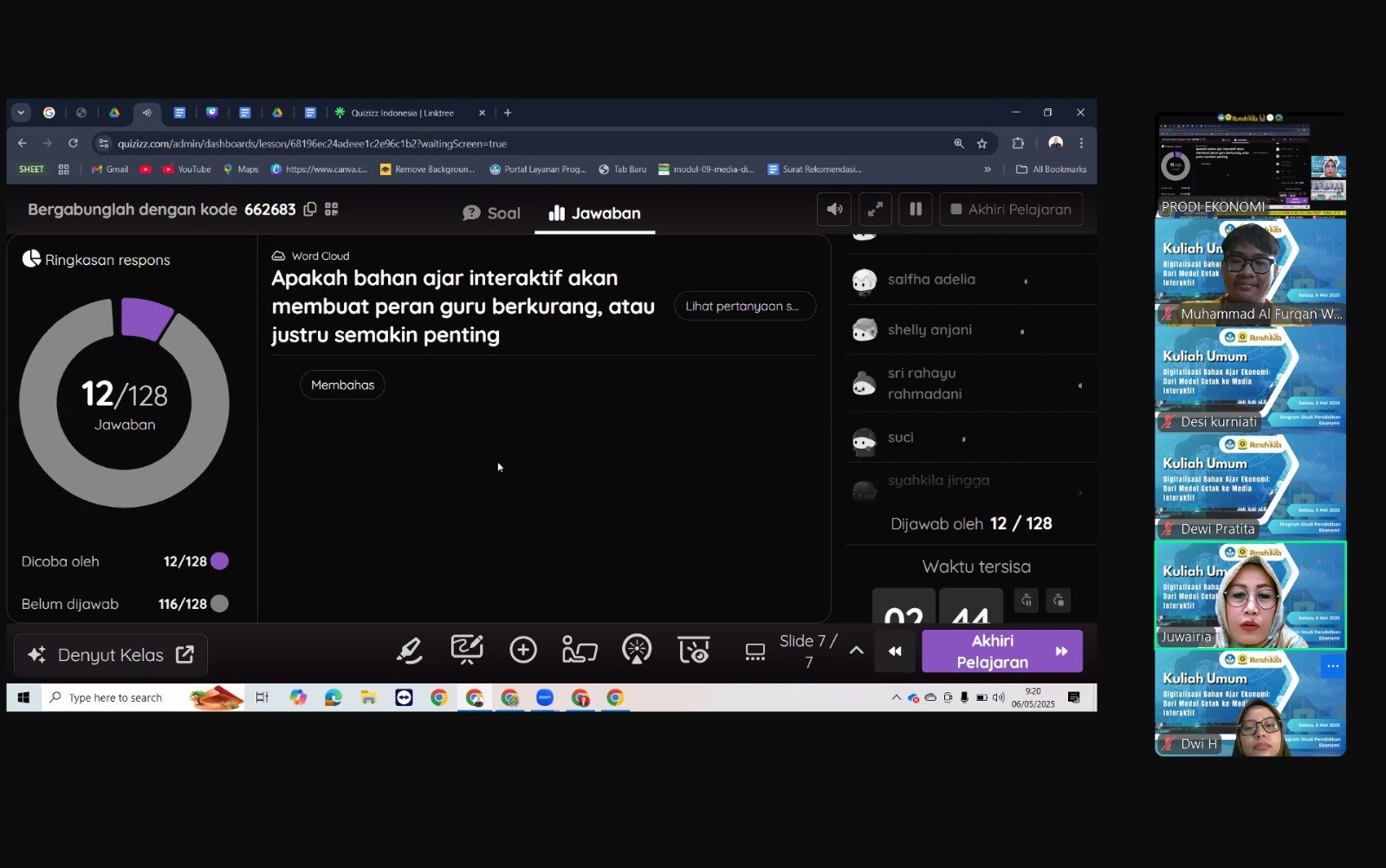 Moderator dalam kegiatan ini Bapak Deskoni, S.Pd., M.Pd. membacakan secara lengkap CV Ibu Juwairia, M.Pd. yang menjadi narasumber dalam kegiatan kuliah umum ini, beliau merupakan seorang guru penggerak, praktisi pendidikan dan coach beberapa media pembelajaran interaktif nasional sehingga melalui kepakarannya tersebut dipilih menjadi narasumber kuliah umum hari ini karena sesuai bidangnya untuk dapat membagi informasi terkait tema kuliah umum hari ini. Beliau mengemukakan bahwa pendidik harus dapat membuat suasana kelas menjadi lebih menyenangkan dalam belajar, interaktif dan tidak membosankan. Penggunaan berbagai macam platform untuk menghadirkan media pembelajaran interaktif dapat digunakan dalam pembelajaran. Untuk kegiatan hari ini narasumber banyak mengulas lebih mendalam terkait penggunaan quizizz yang ternyata tidak hanya dapat digunakan untuk membuat soal dalam bentuk pilihan ganda atau isian saja tetapi banyak lagi seperti bagaimana membuat soal dari satu video yang wajib ditonton terlebih dahulu oleh peserta didik sebelum melanjutkan ke pertanyaan selanjutnya. Paparan dari narasumber diakhiri dengan kegiatan tanya jawab. Banyak peserta mengajukan pertanyaan secara langsung dengan narasumber, hal ini menunjukkan antusiasme mereka dalam mengikuti kegiatan kuliah umum saat ini.