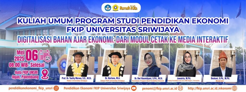 pendidikanekonomi.fkipunsri.org, Program Studi Pendidikan Ekonomi FKIP Universitas Sriwijaya kembali menghadirkan kegiatan kuliah umum dengan tema “Digitalisasi Bahan Ajar Ekonomi: Dari Modul Cetak ke Media Interaktif” yang dilaksanakan pada hari Selasa, 6 Mei 2025 bertempat di Aula FKIP lantai 3 Kampus Ogan Palembang. Kegiatan ini diikuti oleh seluruh mahasiswa aktif program studi pendidikan ekonomi secara daring melalui zoom meeting.