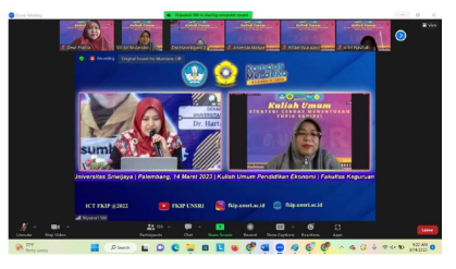 Palembang, 14 Maret 2023 – Program Studi Pendidikan Ekonomi FKIP Universitas Sriwijaya mengadakan Kuliah Umum dengan tema ”Strategi Cerdas Menentukan Topik Skripsi”. Acara ini berlangsung secara daring pada pukul 08.00 hingga 12.00 WIB, dihadiri oleh 165 mahasiswa Program Studi Pendidikan Ekonomi, serta mengundang dosen dan alumni yang memiliki kepentingan dalam penulisan skripsi.