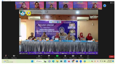 Palembang, 14 Maret 2023 – Program Studi Pendidikan Ekonomi FKIP Universitas Sriwijaya mengadakan Kuliah Umum dengan tema ”Strategi Cerdas Menentukan Topik Skripsi”. Acara ini berlangsung secara daring pada pukul 08.00 hingga 12.00 WIB, dihadiri oleh 165 mahasiswa Program Studi Pendidikan Ekonomi, serta mengundang dosen dan alumni yang memiliki kepentingan dalam penulisan skripsi.