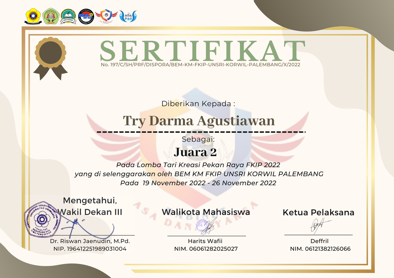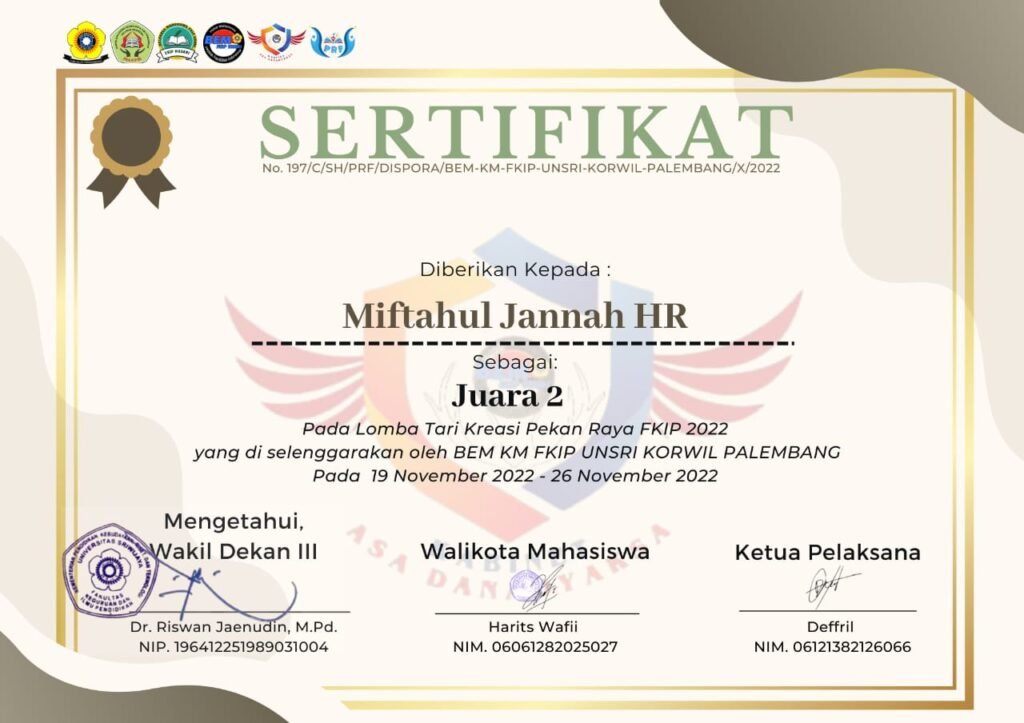 Mahasiswa Pendidikan Ekonomi Fakultas Keguruan dan Ilmu Pendidikan (FKIP) Universitas Sriwijaya kembali menorehkan prestasi gemilang, tidak hanya dalam bidang akademik tetapi juga di bidang seni dan budaya. Tim tari yang terdiri dari Try Darma Agustiawan, Miftahul Jannah, Soni Anderwan, dan Janawati berhasil meraih Juara 2 dalam Lomba Tari Kreasi yang merupakan bagian dari Pekan Raya FKIP 2022.
