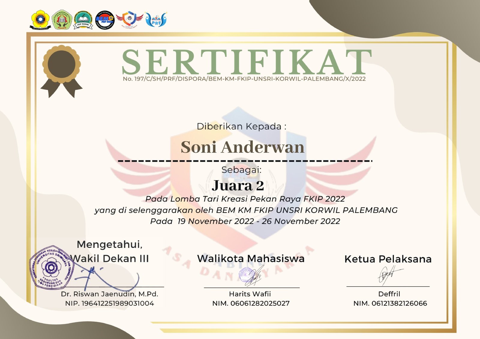 Kompetisi ini diselenggarakan oleh Badan Eksekutif Mahasiswa KM FKIP Universitas Sriwijaya Koordinator Wilayah Palembang pada 19–26 November 2022 dengan skala nasional. Lomba Tari Kreasi ini menjadi ajang bagi mahasiswa dari berbagai perguruan tinggi untuk menampilkan kreativitas dan keindahan gerak dalam seni tari modern maupun tradisional yang dikreasikan dengan inovasi baru.