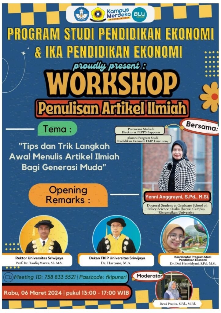 Program Studi Pendidikan Ekonomi Universitas Sriwijaya kembali membuktikan komitmennya dalam mencetak mahasiswa berkualitas dengan menyelenggarakan workshop bertema “Tips dan Trik Langkah Awal Menulis Artikel Ilmiah Bagi Generasi Muda”. Kegiatan ini berlangsung pada Rabu, 6 Maret 2024, secara hybrid di Aula FKIP Ogan Palembang dan daring melalui Zoom.